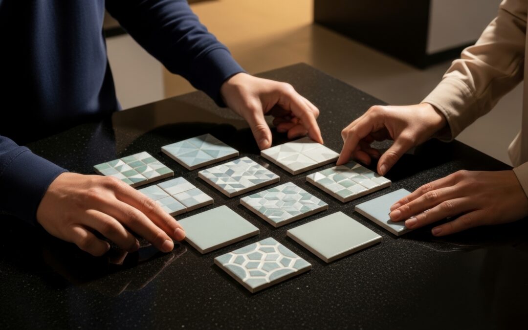 - Prepara combinaciones ya montadas sobre paneles (suelo + zócalo + listelo) y una muestra húmeda (plato de ducha o área con 1–2 azulejos mojados) si procede.